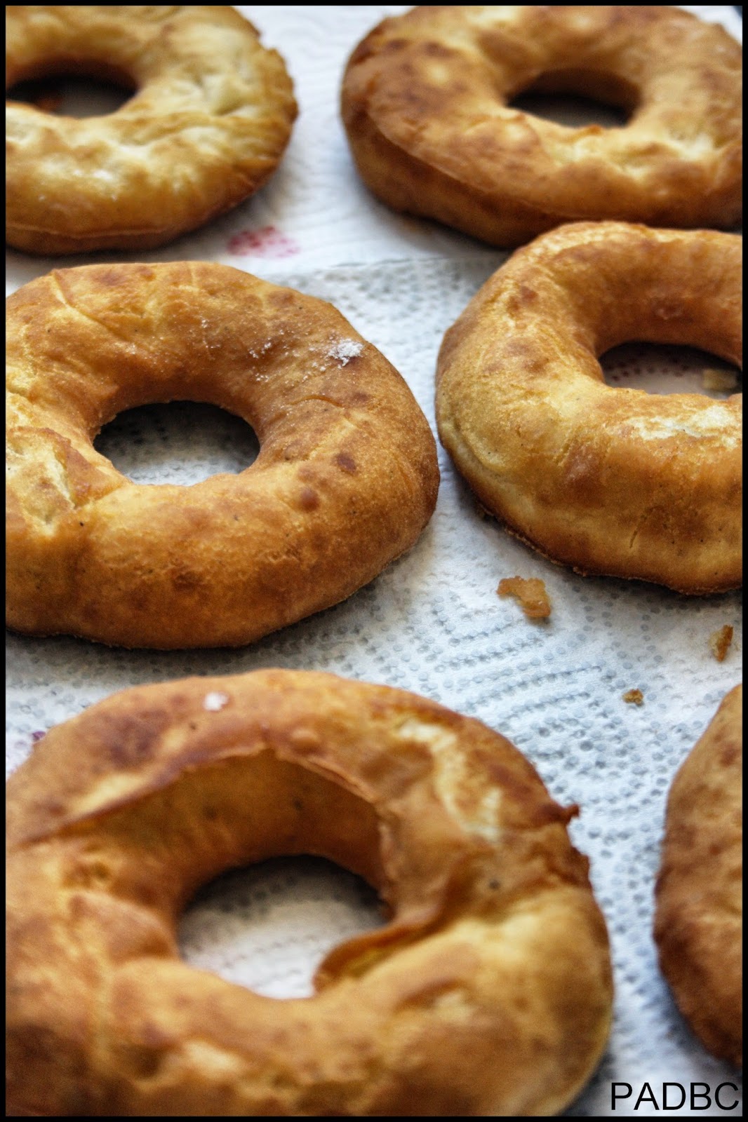 Petite astuce, récupérez les chutes de pâtes une fois vos donuts découpés et rassemblez-les pour former de petits tas de pâte que vous ferez également frire (ceux-ci seront plus croustillant, on les appelle des fritters).