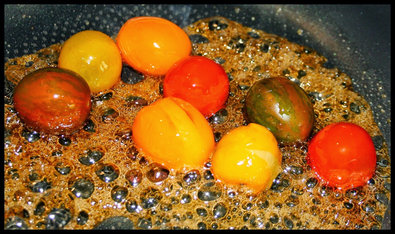 Pour la décoration prendre quelques tomates dans la barquette « méli-mélo » en essayant de varier les couleurs et les placer dans une poêle avec du sirop d’érable. Comme précédemment, faites cuire en arrosant bien les tomates mais stoppez la cuisson après obtention d’un caramel recouvrant les tomates. Réservez.