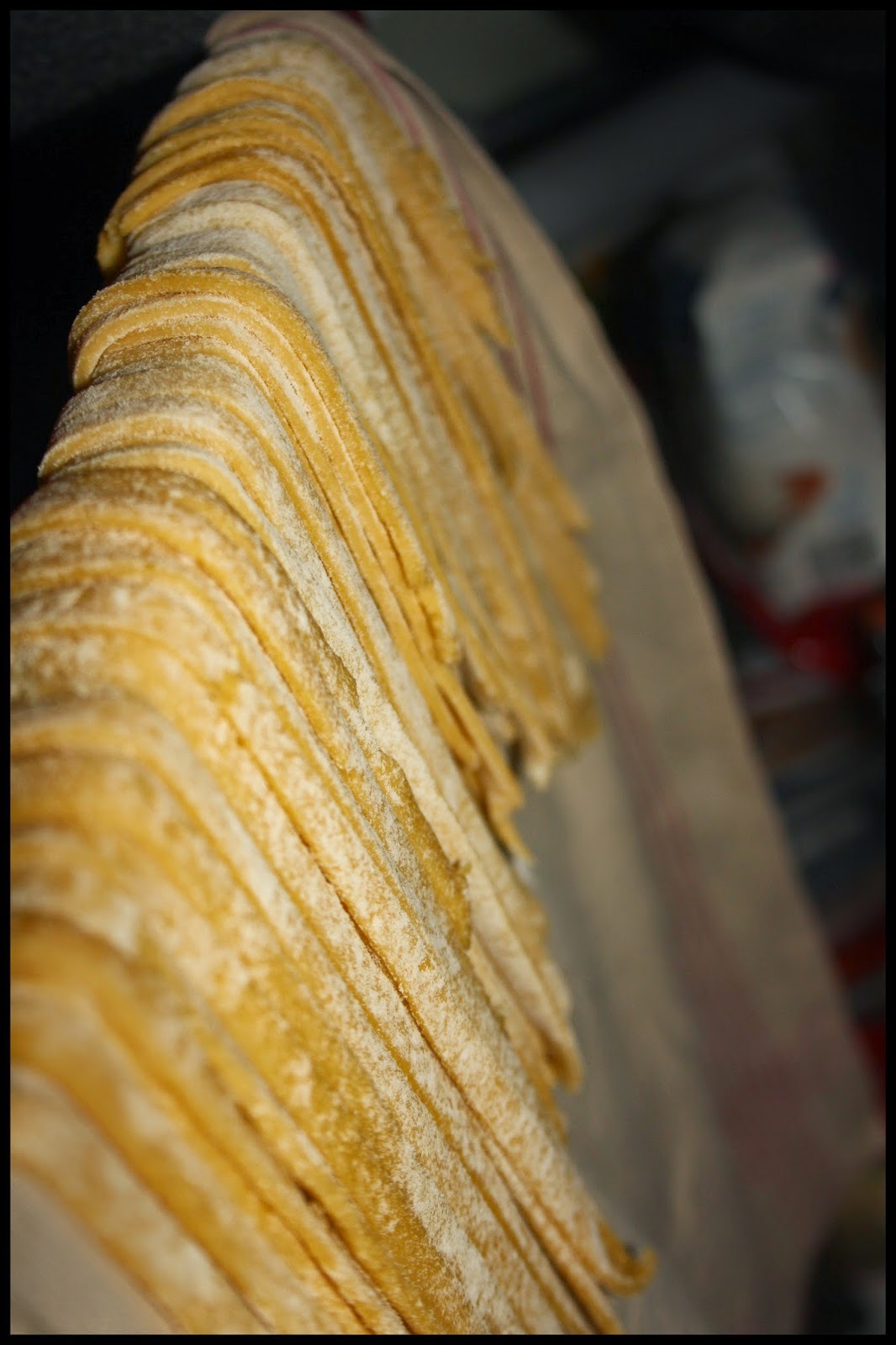 Mettez ensuite les pâtes à sécher au moins 1 heure (inutile d’investir dans un séchoir à pâte, déployez un torchon sur le haut d’une porte de placard et déposez-y les pâtes bien farinées)