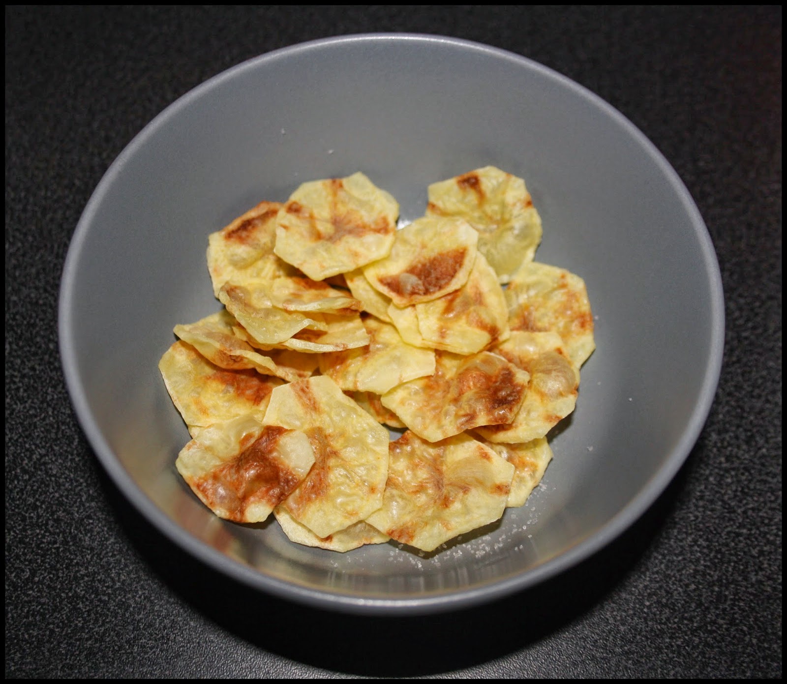 Si tu veux mieux saler tes chips, tu peux, avant de les mettre au micro-onde, les frotter avec du sel (ou même des épices pour le goût). Surtout, ne prend pas peur de la couleur légèrement brune que les chips peuvent prendre, au contraire, elles seront ainsi plus croustillante 🙂