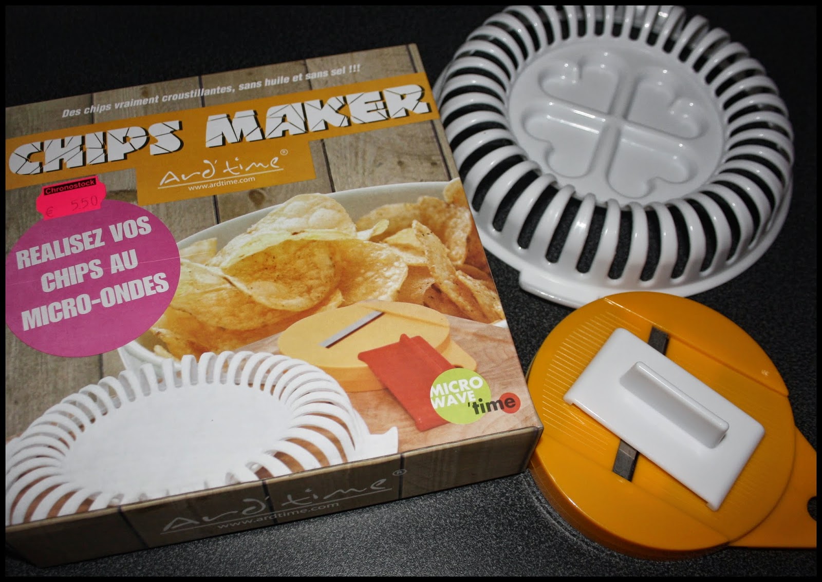 Tout d’abord, une petite présentation de la bête : il s’agit soit d’une plaque de plastique perforée soit d’une « couronne » présentant des emplacement pour les chips… Rien de bien impressionnant me direz-vous, et je vous l’accorde. Il est disponible dans de nombreuses marques et à des prix très variables : personnellement j’ai payé le mien 5€50 dans un magasin éphémère (système en couronne) et j’ai également pu tester la version Mastrad (plateau perforé) qui a été offerte à mes parents, je vous direz donc en fin d’article, s’il y a une différence entre les deux.